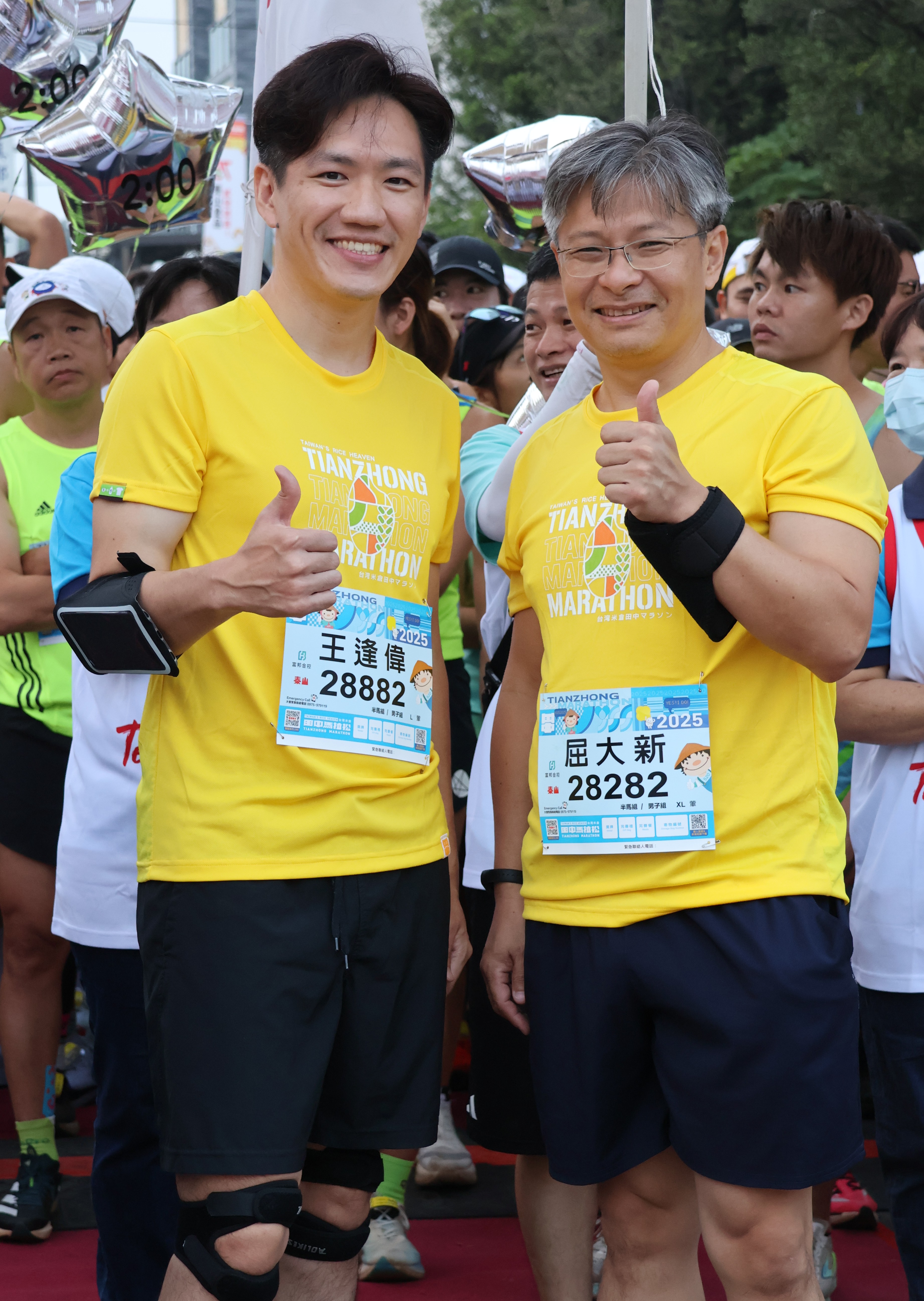 ▲合祥地產董事長王逢偉(左)與董事屈大新(右)擔任半馬組領跑人,賽前於起跑點合影,展現以行動支持地方運動盛事的熱情。