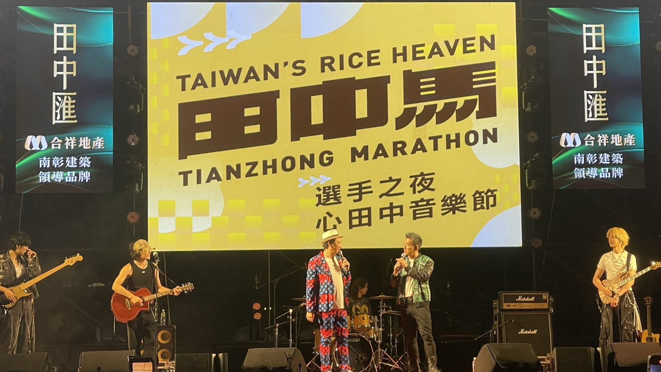 ▲田中馬拉松選手之夜《心田中音樂節》熱力四射,田中子弟任賢齊(右2)返鄉開唱掀起熱潮,現場氣氛熱烈。舞台兩側同步展示合祥地產「田中匯」品牌主視覺,彰顯企業深耕地方、支持文化活動的熱忱。